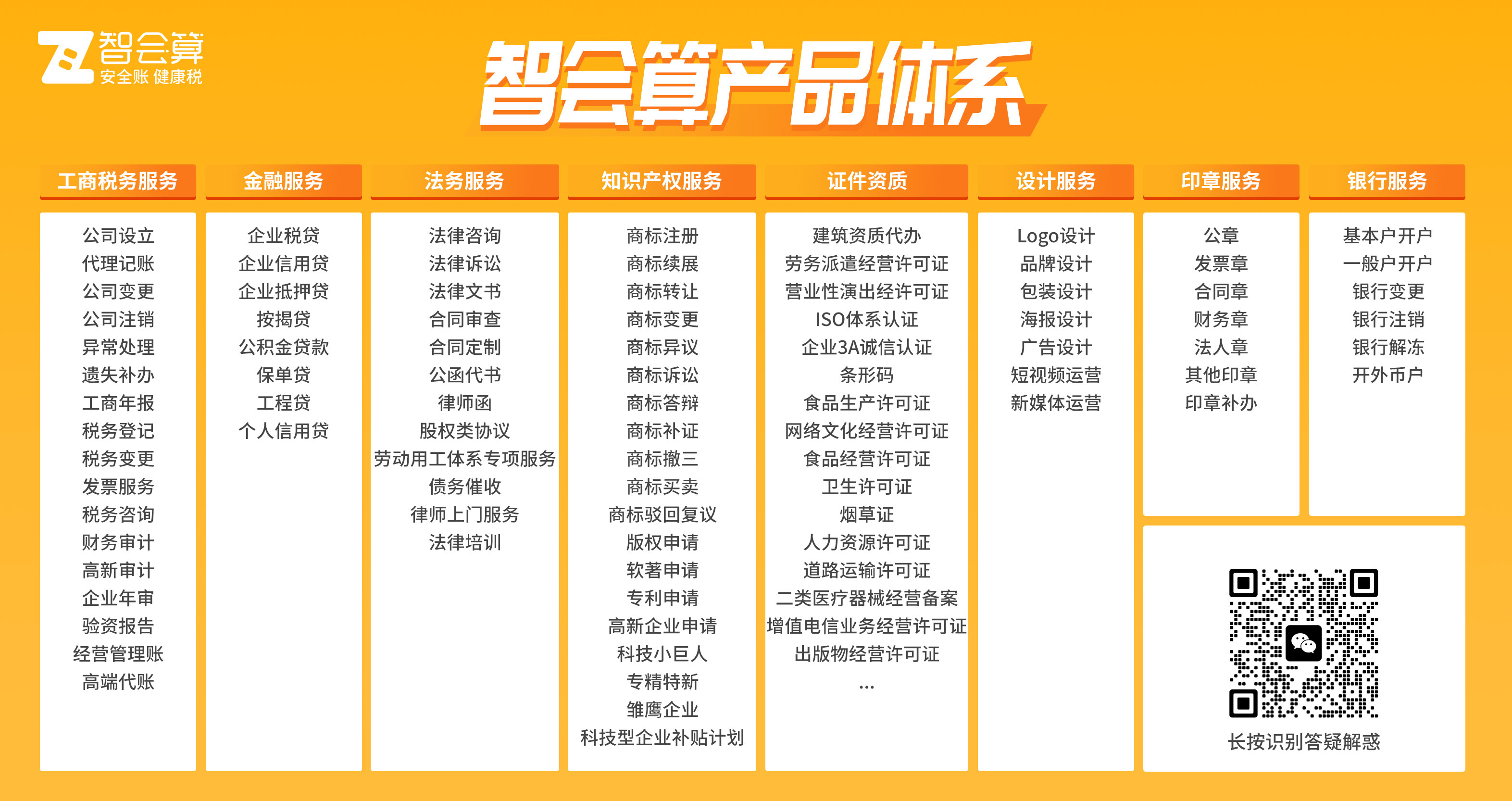 智会算隶属于福建智会算信息科技有限公司,成立于2017年6月,是一家基于“数字化+企业生态”服务,专注为中小微企业提供工商注册、代理记账、财务外包、商标注册、知识产权、项目申报、法务咨询、金融服务等综合性的企服科技型公司。公司始终秉承以“为中小微企业发展赋能”为使命,致力于满足企业生命全周期各种需求。智会算立足于“安全账,健康税”的服务理念,自主研发从前端CRM到后端SaaS财务工具全套交付系统,实现服务线上化、自动化、智能化和生态化,从财务预警和检测多方位利用数字化技术来保障客户账税安全,真正为合作企业提供多、快、好、省的财税及企业生态服务。智会算精耕福建,辐射全国,成立至今6年覆盖16城。目前在省内设置12家直营公司,分别覆盖福州、福清、泉州、石狮、南安、水头、三明、漳州、龙岩、龙岩上杭、宁德、莆田(合资)、全国省代理商广东、陕西、河南也已经展开业务。截止日前,累计服务客户30000+。智会算,立志打造数字化+企业生态服务云平台,让更多的中小微企业运营更高效,为中小微企业发展赋能!