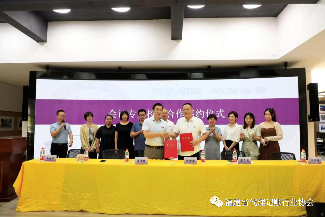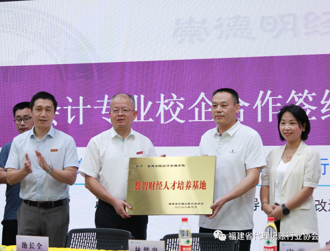 6月23日福建省代理记账行业协会与福建水利电力职业技术学院的经济管理学院签订校企合作。在该校VR综合实训基地就会计类专业举行专业共建签约、人才培养基地与教师企业实践基地揭牌、产业导师聘任、学生实习就业专场宣讲等相关活动。福建省代理记账行业协会会长林梦忠,福州信和财智财税咨询有限公司总经理宋宜美以及福州快点办财税咨询有限公司、福州精账司财务管理有限公司代表和学院党委委员、副院长兼经管学院院长池长全及班子成员及会计20级学生参加本次活动。