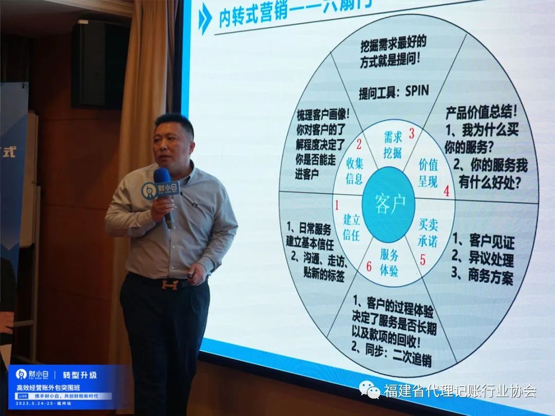 第一天:冯老师讲解了经营账的模式思维,从传统的代账思维转变起来,打造高价值的经营账外包模式,如何从200元/月的代账到4000元/月的经营账转型,破解经营账的难点,建立经营账的完整思维,以及如何运用财小白财税外包多模式经验,“经营账外包,财务外包,会计指导等”,多套模式的标准化体系,从接单、谈单、服务落地全流程剖析分解!晚上陈老师讲解如何帮助代账公司运用好“六扇门”实战方法,标准化营销拓客,降低开发成本,高效完成签单服务,还有经营账外包标品打造的课程,让每个学员都能学有所成回去落地!