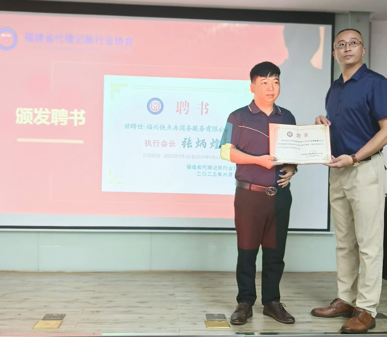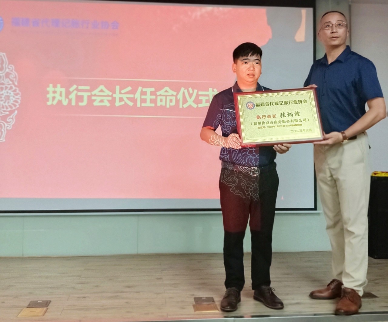 (福建省代理记账行业协会——副会长陈宙峰代表协会向执行会长张炳煌进行授牌、颁发聘书。)