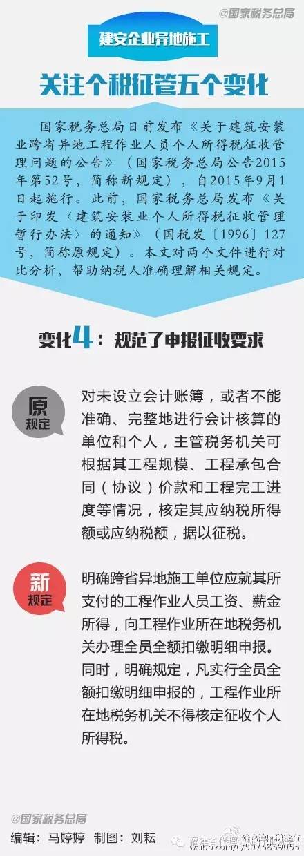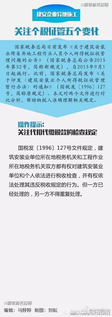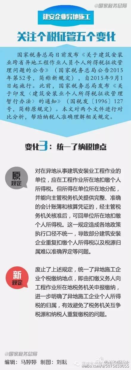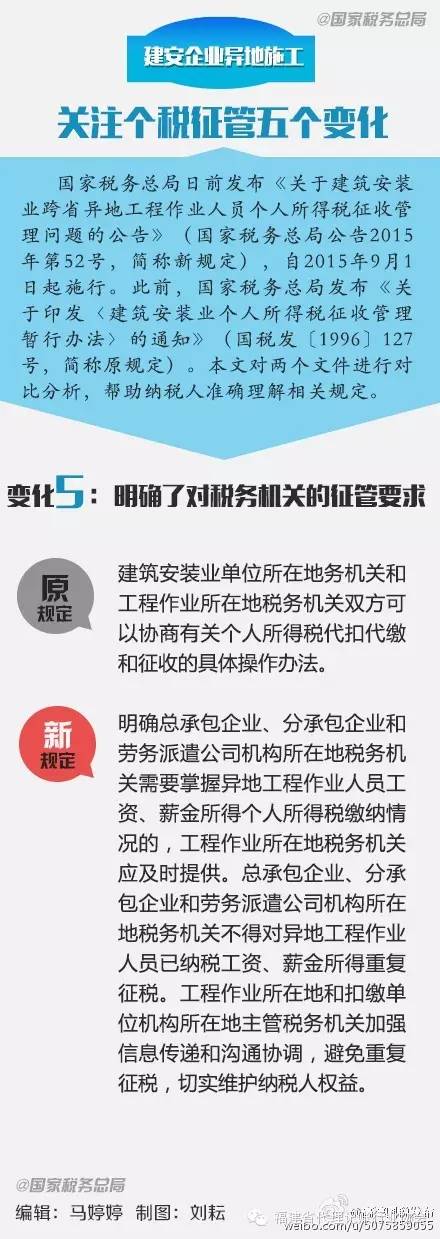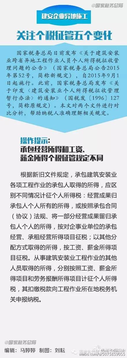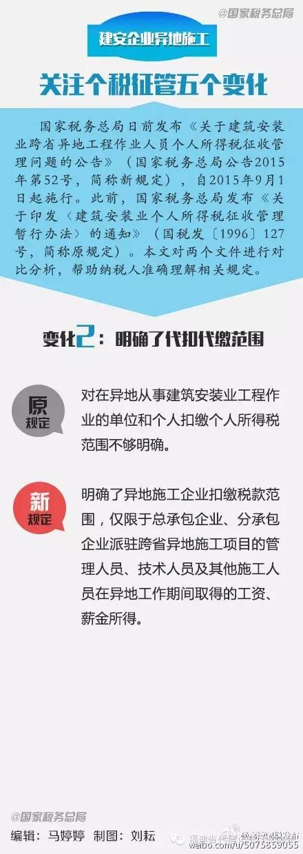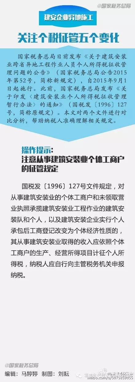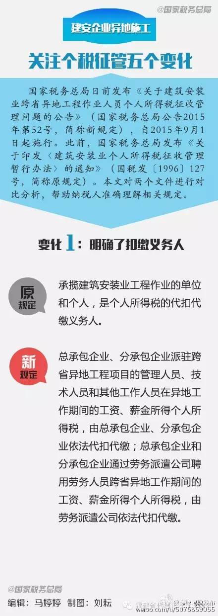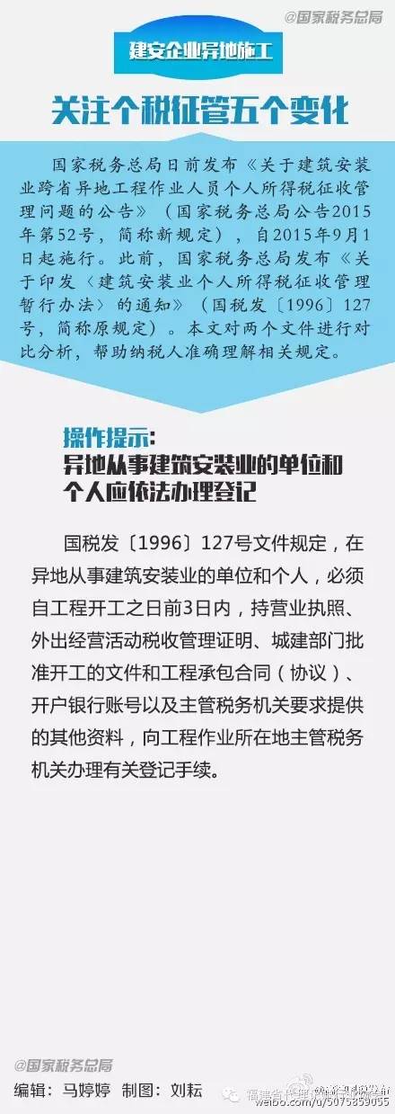 国家税务总局日前发布《关于建筑安装业跨省异地工程作业人员个人所得税征收管理问题的公告》(国家税务总局公告201年第52号,简称新规定,全文请点击本微信左下方“阅读原文”查看),自2015年9月1日起实施。此前,国家税务总局发布《关于印发<建筑安装业个人所得税征收管理暂行办法>的通知》(国税发〔1996〕127号,简称原规定)。