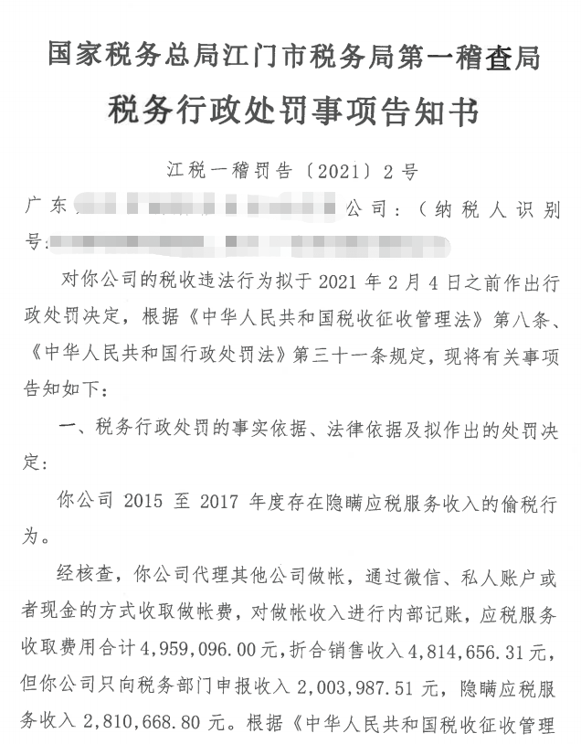广州市某信息咨询公司,经核查,通过微信、私人账户或者现金方式收取做账费,其中隐匿收入281万元,最终稽查补税85万,罚款42万元。