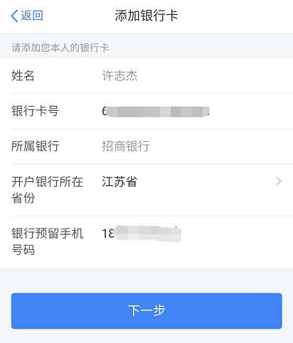 点击添加按钮输入银行卡号信息、开户银行所在省份、银行预留手机号码,(注意:需要境内账户,以I类卡为优)