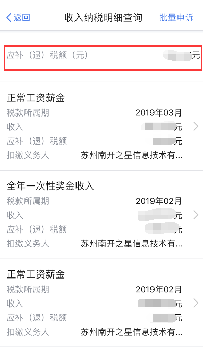 最上方会显示总的应补退税额,下方有明细数据,点击明细数据进入后,查看具体明细情况。