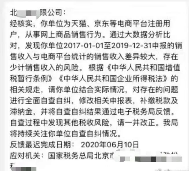 最近,很多网店店主收到了当地税务部门通过电子税务局发送的“风险自查提示”,提醒自家店铺2017-2019年度电商平台收入对不上缴税款,要求企业自查3年以来存在的漏报问题并补缴税款以及滞纳金。